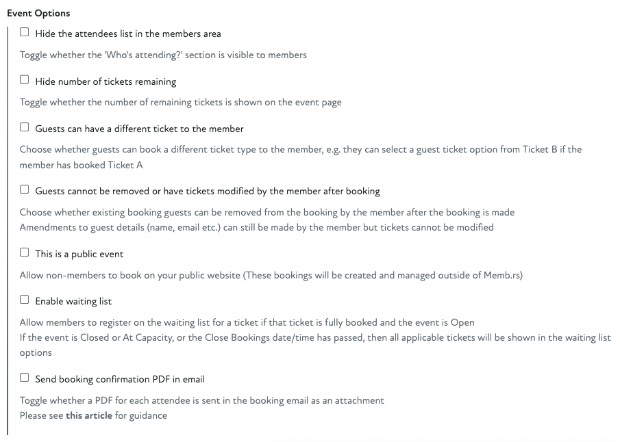 Event options can be used to enable specific functionality or toggle the display of elements in the Members Area.