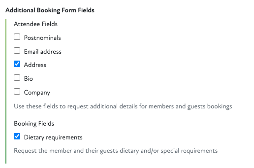 If selected, these will then be shown on the booking form as optional fields for members to complete when they make or amend their bookings.