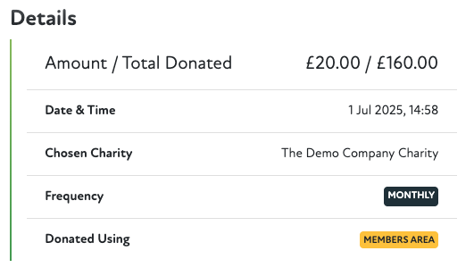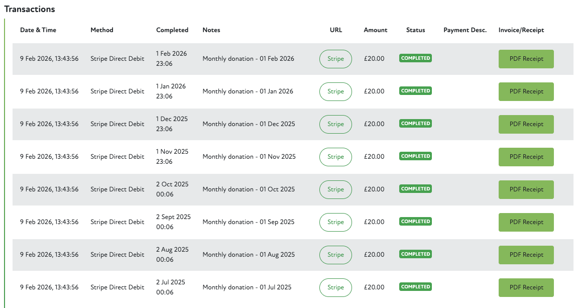 The system now listens for Stripe to confirm that each months payment has been created and will then create that months transaction against the members donation.