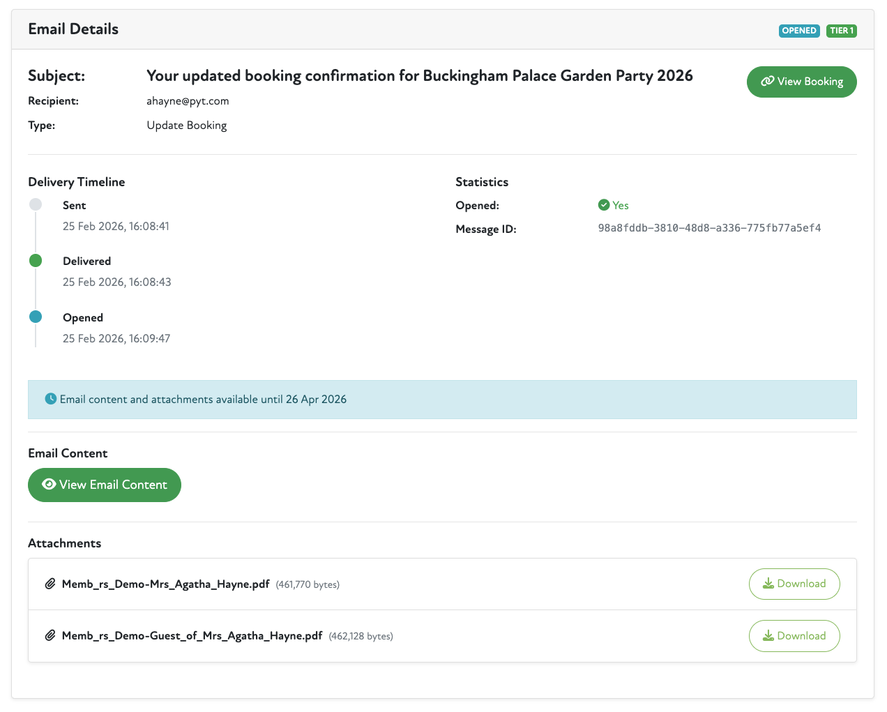 - Any emails sent to members for bookings will be shown