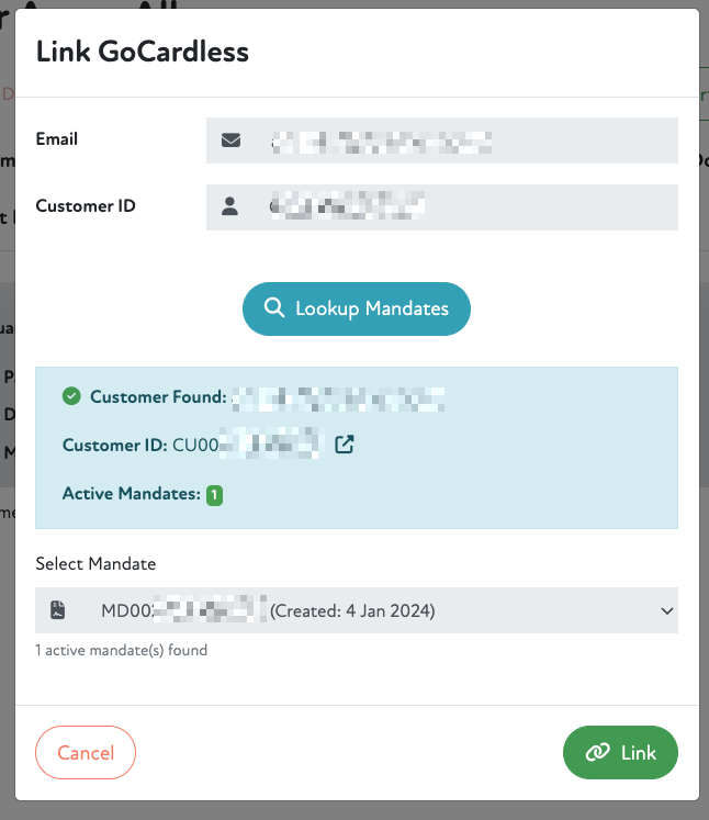 The mandate can be selected and the pressing the Link button will link that Customer ID and mandate to the member record.