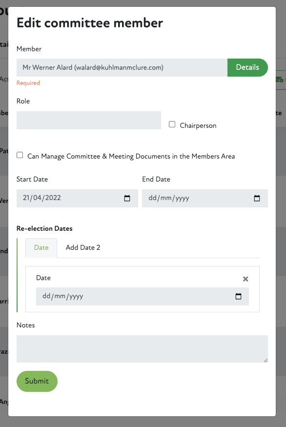 Updating a committee member is similar to the above, instead of using the Add member button press the Edit button against their name on the page.