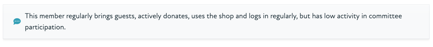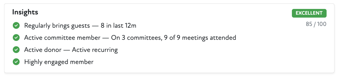 - Positive insights (green tick) - areas where the member is active, e.g. "Strong event attendance"