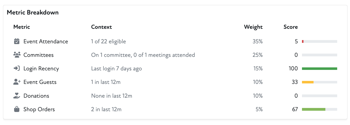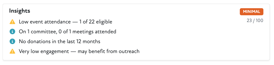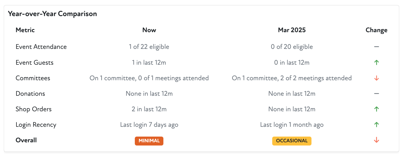 - Context -a plain-English description of the member's activity, e.g. "8 of 12 eligible" for events or "On 2 committees, 6 of 8 meetings attended"