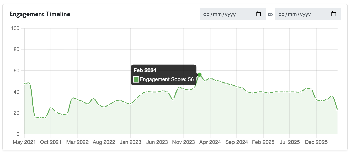 When you open a member's Engagement tab, their score is calculated live from the latest data. The timeline chart uses daily snapshots that are generated overnight, so historical trends are always up to date as of the previous day.