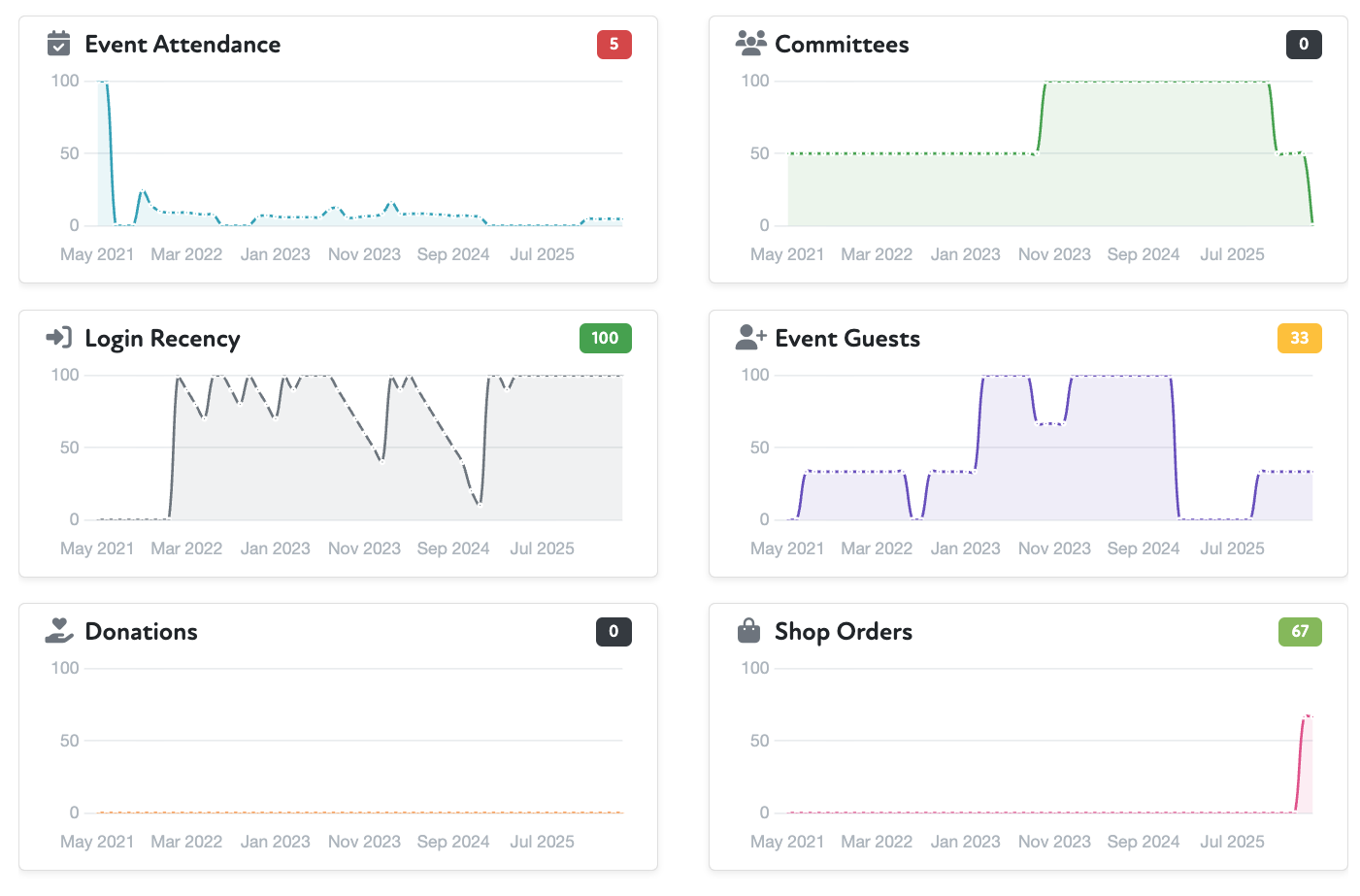 These charts make it easy to see which areas of engagement are improving or declining independently of the overall score. For example, a member's overall score might be stable, but their event attendance could be dropping while their committee participation is increasing.